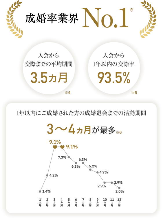※1 株式会社DRC調べ 2024年2月 ※2 2022年10月~2023年3月の成婚退会者実績 ※3 2022年10月~2022年12月入会者実績