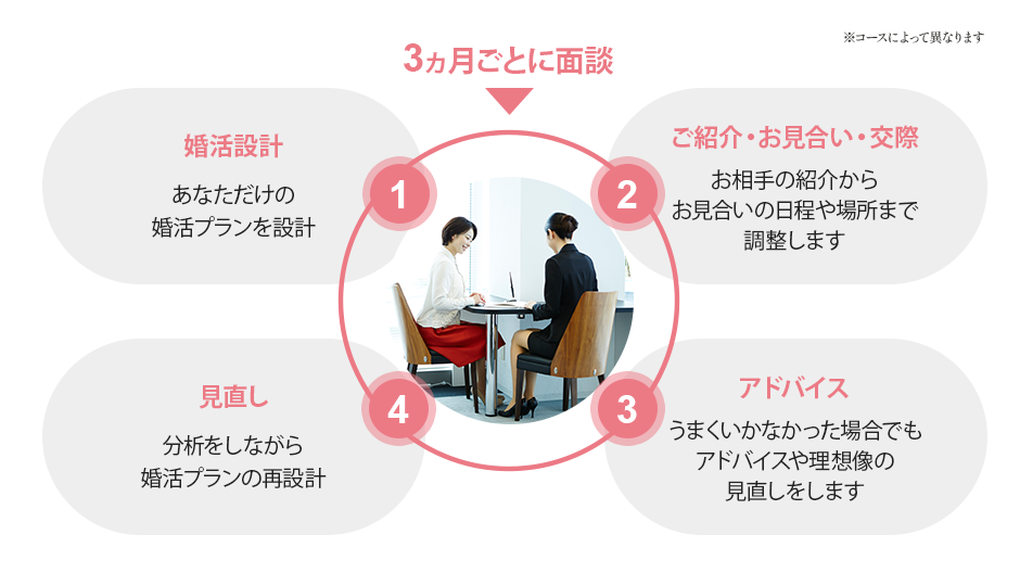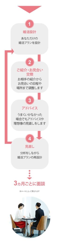 会員様1人1人に専任のコンシェルジュがついて、不安なことを相談しながら婚活を進めていくことができます。